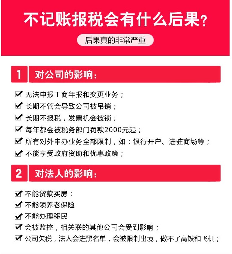 海南公司不記賬報(bào)稅會(huì)有什么后果,首先影響比較大是法人,法人代表無(wú)法貸款買(mǎi)房,不能辦移民、不能領(lǐng)養(yǎng)老保險(xiǎn)等后果、再次是對(duì)于公司的后果也很?chē)?yán)重,如產(chǎn)生罰款還被列入異常黑名單所有業(yè)務(wù)都被限制。