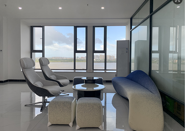 辦公場(chǎng)地從原先的 400 多平擴(kuò)大至 800 多平,新址位于海南省??谑忻捞m區(qū)濱江路 80 號(hào)灃辰外灘 B 座 12 樓,抵達(dá) 12 樓,自動(dòng)門打開首先映入眼簾的就是明亮大氣的登尼特前臺(tái)。
