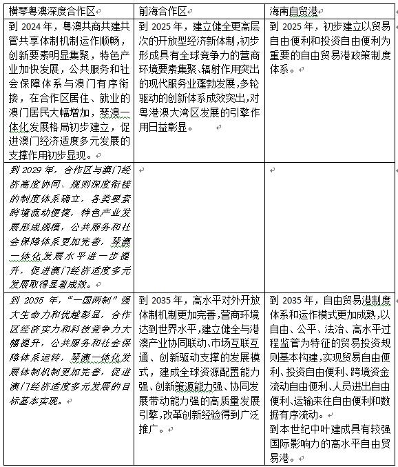 到2035年,三個(gè)地區(qū)的發(fā)展目標(biāo)各不相同。橫琴的目標(biāo)是琴澳一體化發(fā)展體制機(jī)制更加完善,促進(jìn)澳門經(jīng)濟(jì)適度多元發(fā)展的目標(biāo)基本實(shí)現(xiàn)。前海