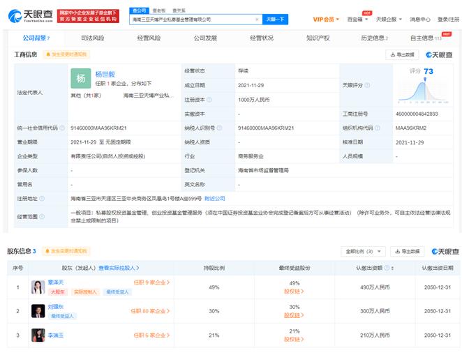 據(jù)天眼查顯示,11月29日,海南三亞天博產(chǎn)業(yè)私募基金管理有限公司成立,注冊(cè)資本1000萬人民幣,法定代表人楊世毅。經(jīng)營(yíng)范圍含一般項(xiàng)目私募股權(quán)投資基金管理、創(chuàng)業(yè)投資基金管理服務(wù)。該公司由章澤天、劉強(qiáng)東、李瑞玉共同持股。