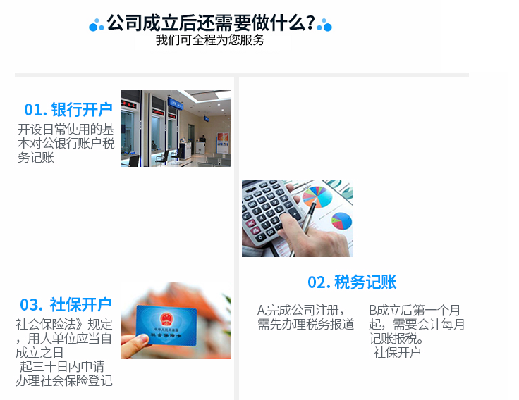其次是??谛鹿径悇沼涃~,已完成新公司注冊需要先去??诙悇站洲k理稅務報道,在成立后一個月起會計每個月記賬報稅;再次是??谛鹿旧绫i_戶,社會保險法規(guī)定,用人單位應當自成立之日起三十日內(nèi)申請辦理社會保險登記,至少繳納一人的保險。